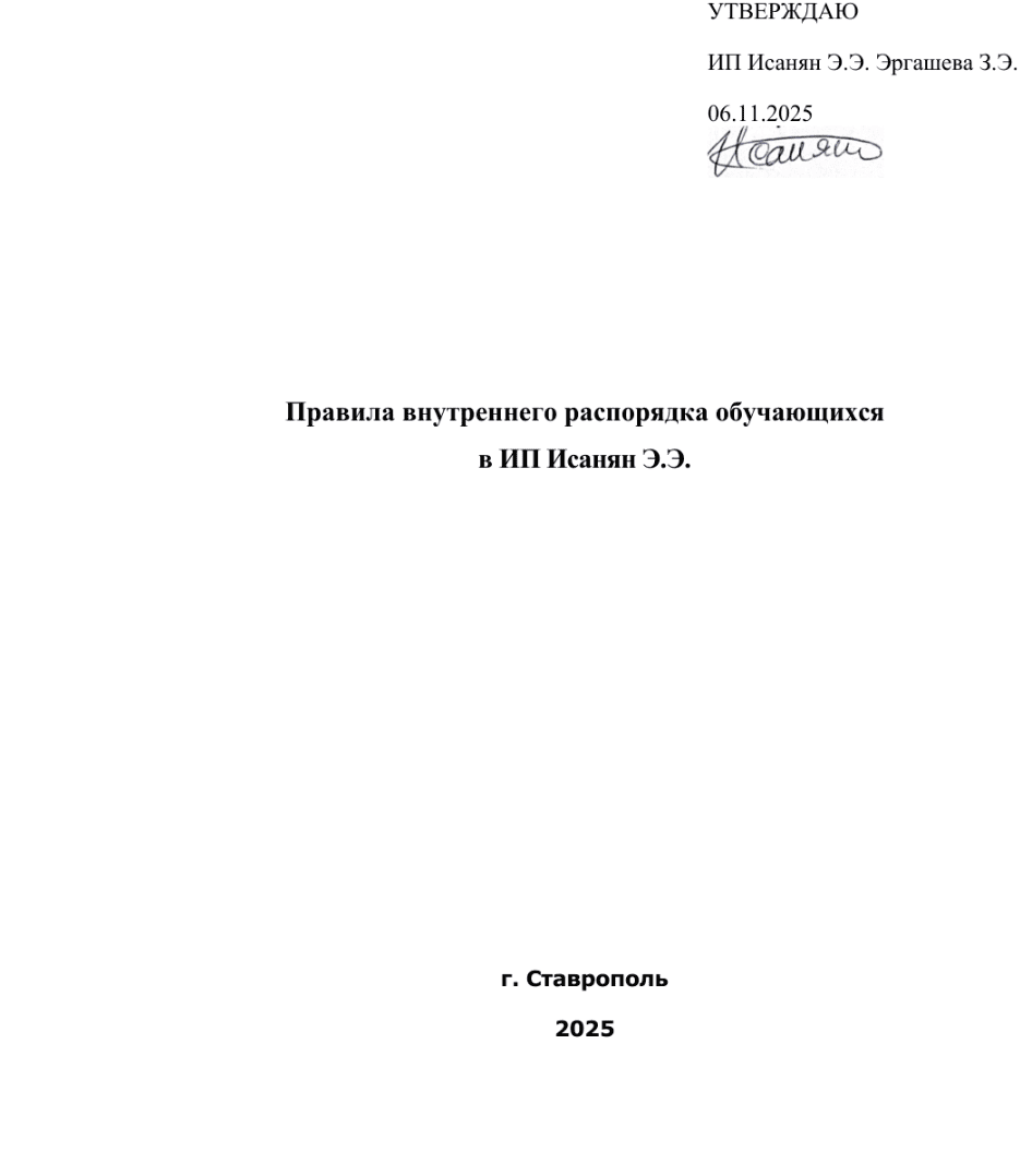 - Настоящие Правила внутреннего распорядка обучающихся у ИП Исаняна Э.Э. (в дальнейшем - «Организация») разработаны в соответствии с нормами Конституции РФ, федерального закона № 273-ФЗ от 29.12.2012 г. «Об образовании в Российской Федерации», “Порядком применения к обучающимся и снятия с обучающихся мер дисциплинарного взыскания”, утвержденных приказом Минобрнауки РФ от 15.03.2014 г. № 185, устава Организации, Положения об учебном центре Организации в целях урегулирования поведения обучающихся Организации применительно к условиям образовательной деятельности Организации и организации учебного процесса.