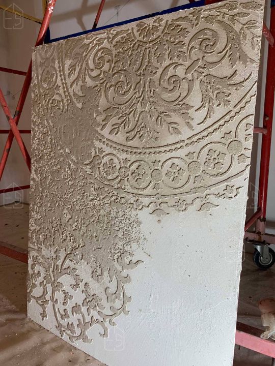 Декоративная штукатурка в лестничной зоне с трафаретной росписью. (Стена 60 кв.м., высота 9 метров)