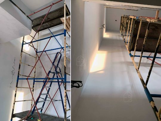 - Поверхность была подготовлена заказчиком под покраску (идеально выровнена), но такая подготовка избыточна для фактурного покрытия. Можно было сэкономить 70-80 тысяч рублей на подготовке стен (при стандартной стоимости 1000-1300 рублей за кв.м.);