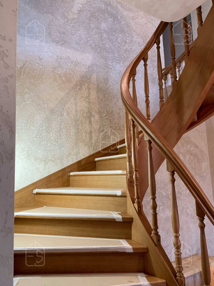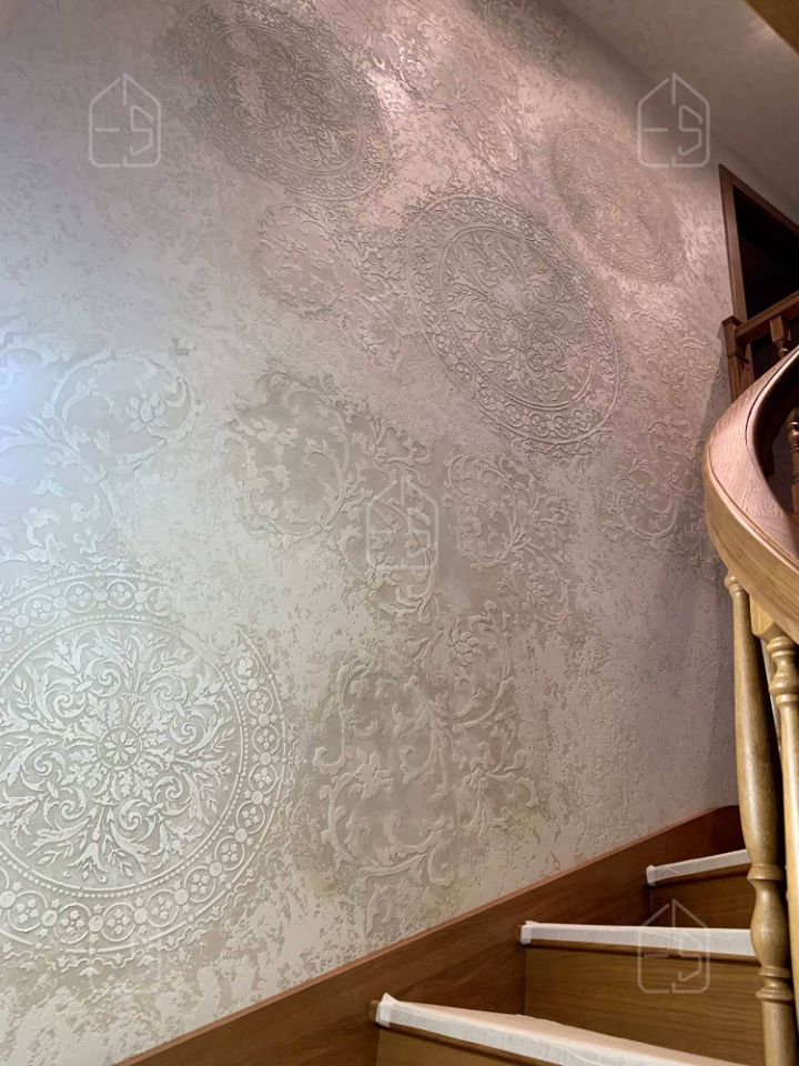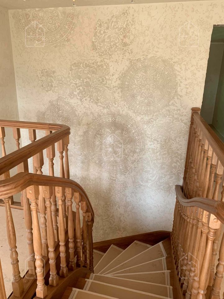 Декоративная штукатурка в лестничной зоне с трафаретной росписью. (Стена 60 кв.м., высота 9 метров)